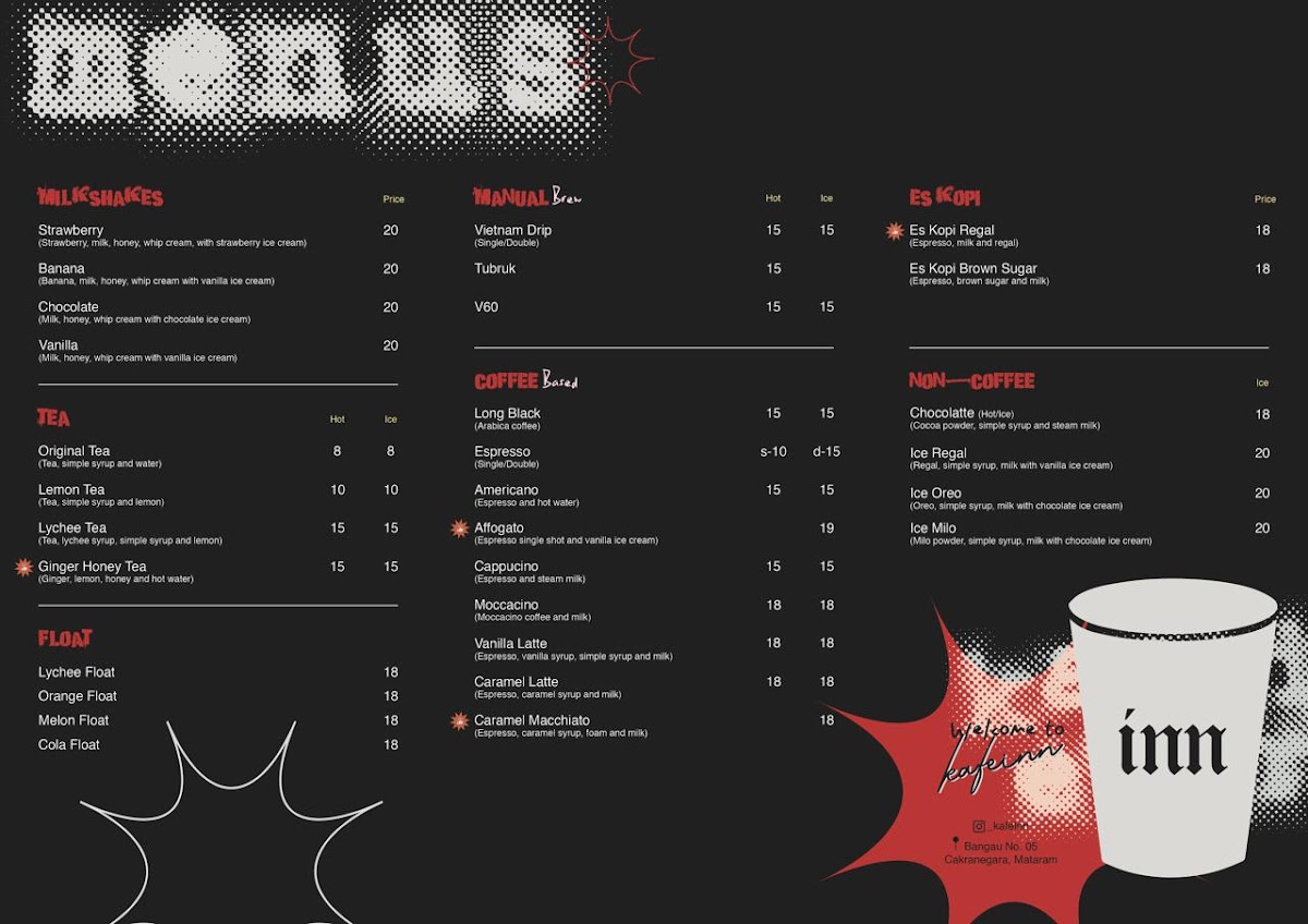 Welcome to Kafeinn, a hidden gem nestled in the heart of Mataram, located at Jl. Bangau No.5, Cakranegara Bar. This delightful café offers a perfect blend of comfort and creativity, making it an ideal spot for both work and leisure. Whether you're seeking a quiet corner to focus on your tasks or a lively atmosphere to catch up with friends, Kafeinn has you covered.